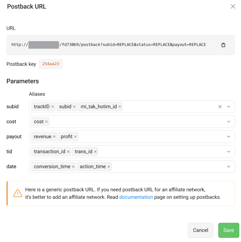 In the case where the affiliate network sends the tracker click parameter only in a specific parameter that differs from subid, you must enter the name of such a parameter in the window so that the tracker can correctly process Postback. You can also set up other parameter names in a similar way.