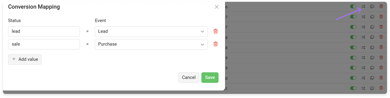 In the integration settings, click Mapping. Select the desired statuses, and events that you want to send to Facebook Ads Manager