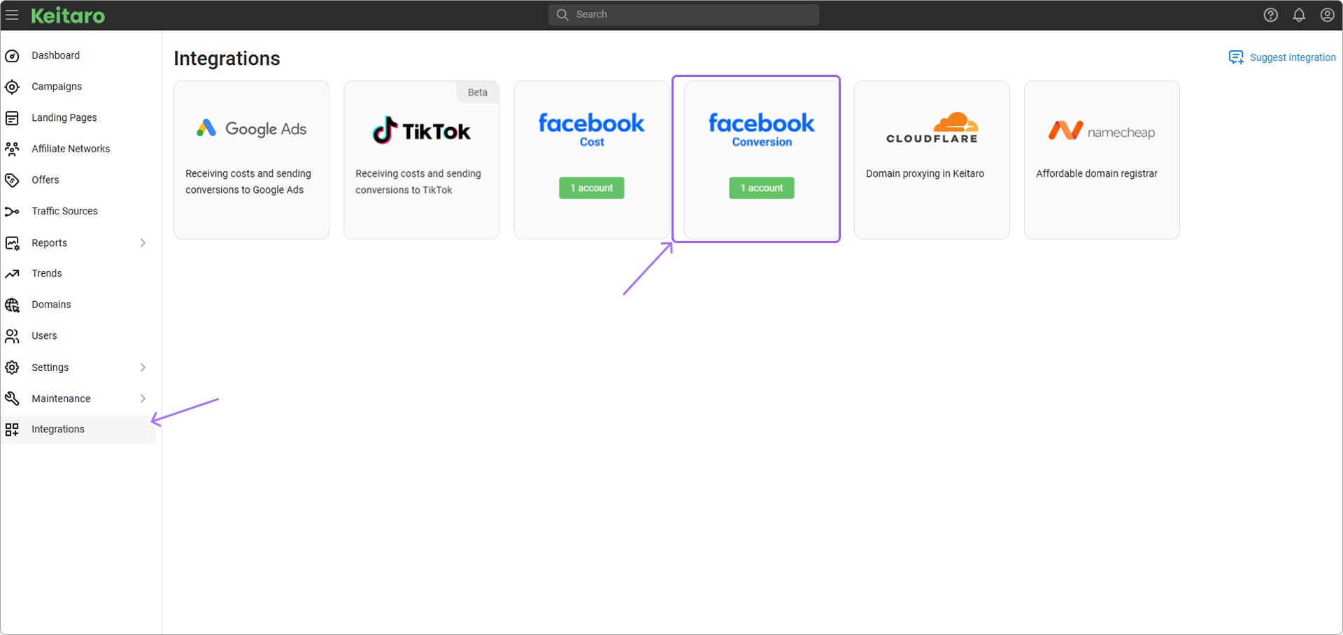 Keitaro collects information about advertising campaign costs via Facebook and sends conversions to optimize ad campaigns on the source side. Cost integration is separate from conversion integration. The integrations transfers conversions and costs to Facebook via API. To transfer conversions via pixel without using integration and API, use the FB Pixel instruction.