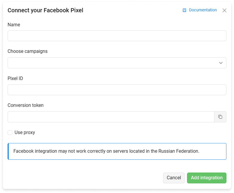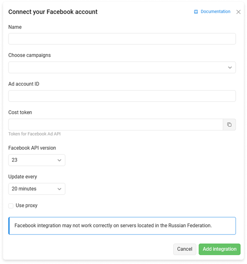 For stable access to Facebook, use a proxy. To set up, go to the created integration or create a new one and select the Use proxy checkbox: