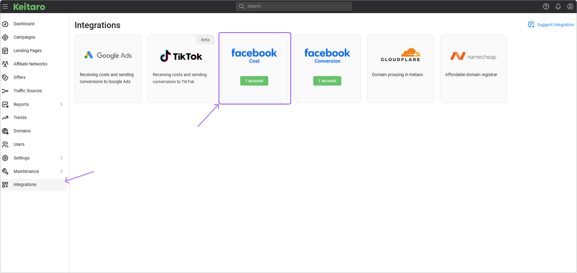 betaOpen Integrations, select Facebook cost integration: