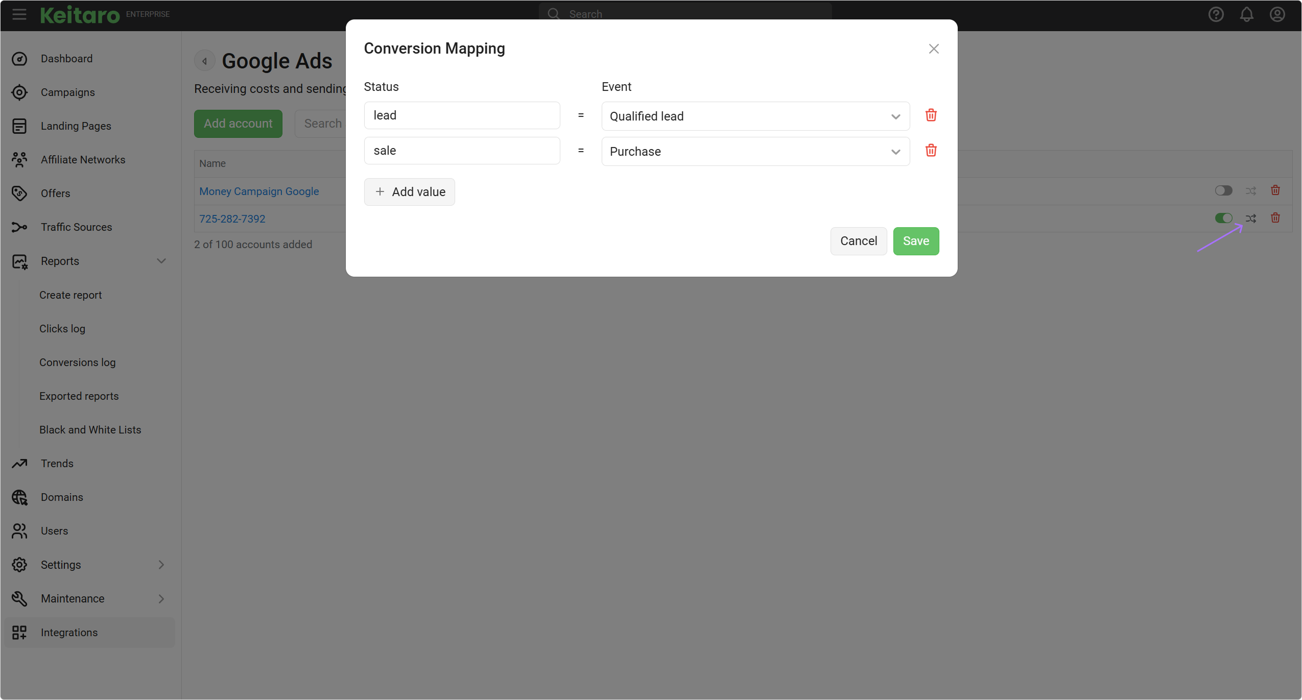 Select the Keitaro campaigns to which you want to send costs from Google account.