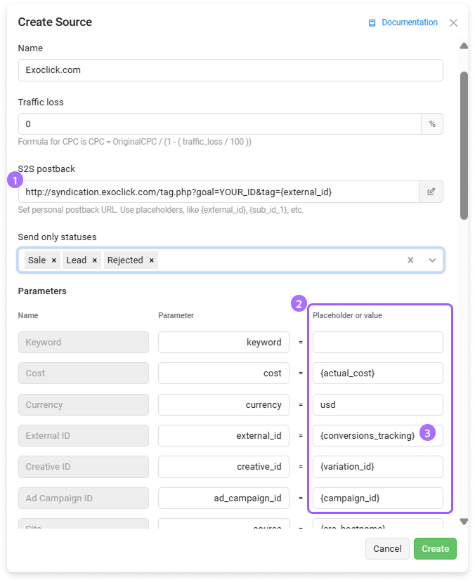 - The link for S2S postback. Please note that in some links you need to change the parameter to your own value. In this example, you need to replace YOUR_ID with your ID from the Exoclick account.