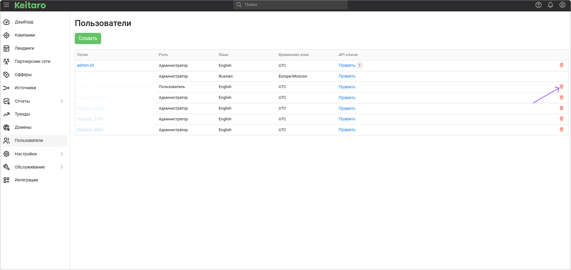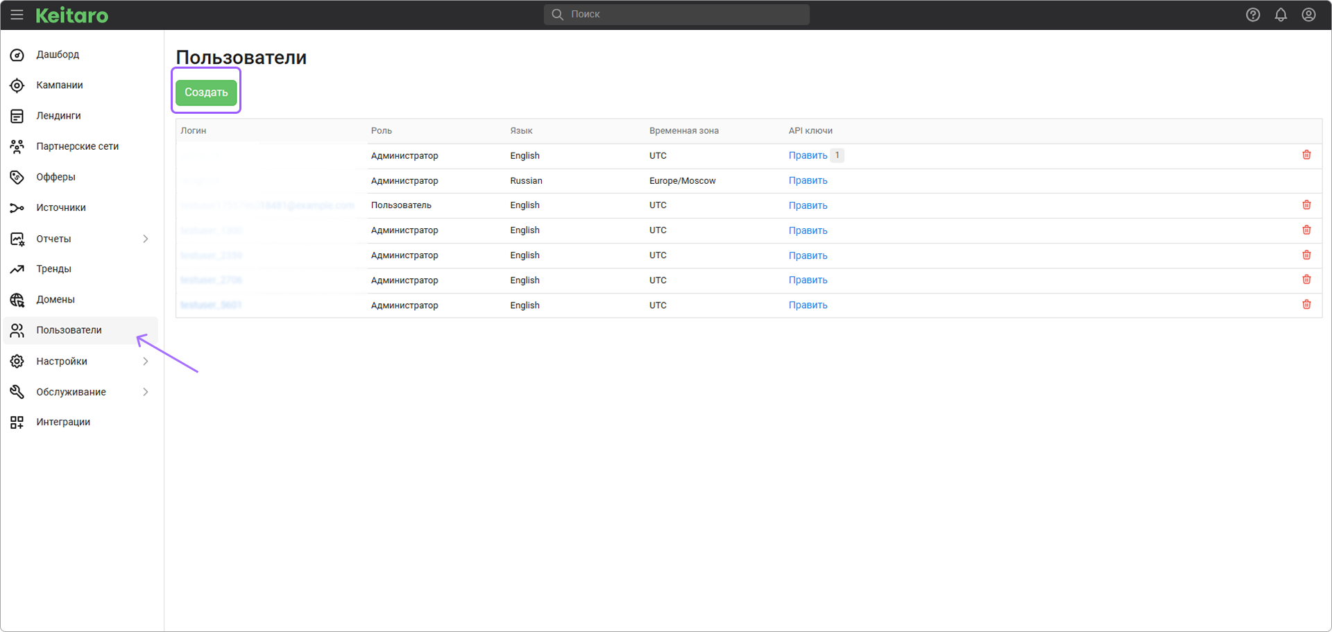 Чтобы создать пользователя, перейдите в меню Пользователи.