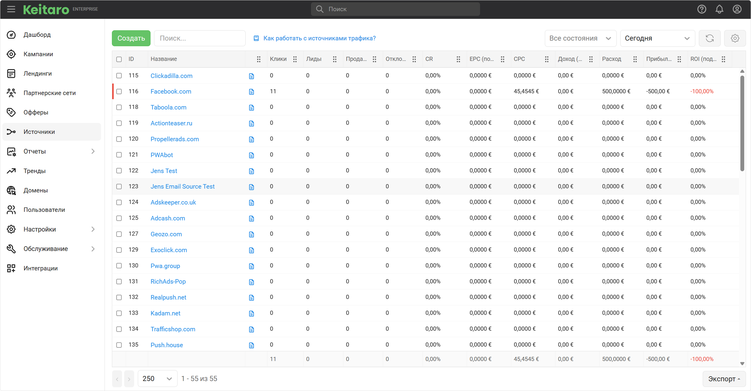 Отфильтровать источники по состоянию С кликами.